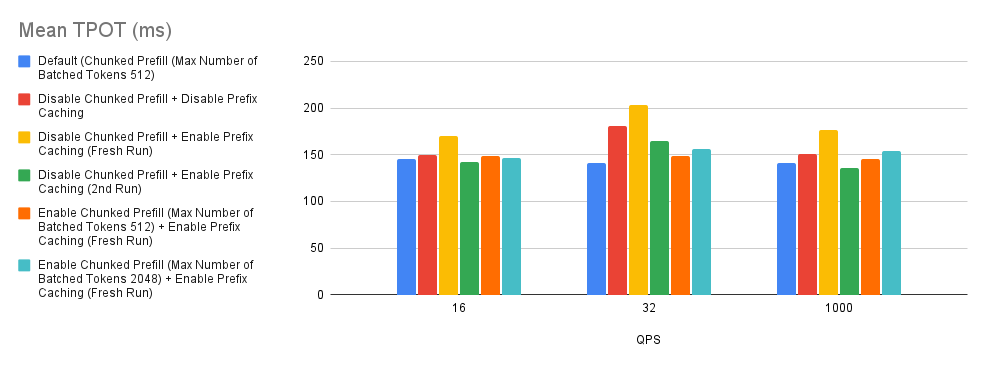 - In our experiments we found that the prefix caching hit rates of Bar 3 (yellow) and Bar 4 (green) are around 0.9% and 50%. Based on the comparison of Bar 3 (yellow) and Bar 4 (green) with the baseline and Bar 2 (red), this tells us that if the user requests do not have high prefix caching hit rate, disabling both chunked prefill and prefix caching might be considered a good rule of thumb.