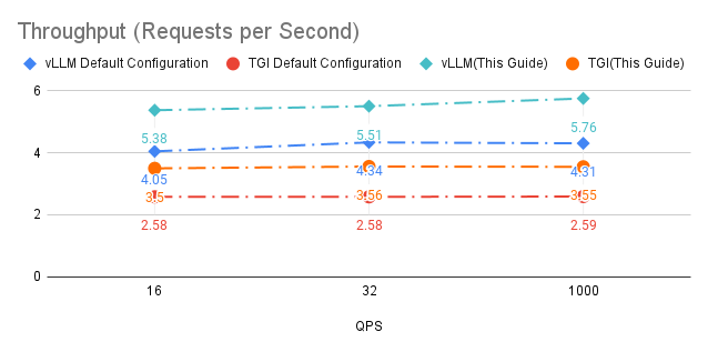 Even in the default configuration, vLLM shows superior performance compared to TGI. For instance, at 16 QPS, vLLM’s default configuration achieves a throughput of 4.05 requests/second versus TGI’s 2.58 requests/second. This performance advantage is maintained across different QPS levels, highlighting vLLM’s efficiency in handling large language model inference tasks.